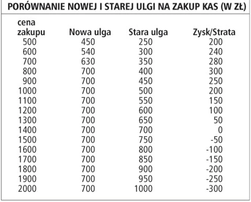 podatnicy zmuszeni do zakupu droższych modeli. Aby w pełni wykorzystać nową ulgę, koszt zakupu kasy nie może przekraczać 778 zł. Kupując taką kasę, uda nam się bowiem odliczyć jeszcze 90 proc. tego, co na taki zakup musimy wydać (kwota netto), czyli odliczymy 700 zł. Później bez względu na cenę, odliczona kwota nie będzie się już zmieniać, i czy kasa będzie kosztowała 1 tys. czy 5 tys. zł, z kwoty wydanej na jej zakup odliczymy tylko 700 zł. Należy jednak pamiętać, że zgodnie z dziś obowiązującymi zasadami osoba kupująca kasę rejestrującą za 778 zł odliczyłaby tylko 387,50 zł, a nie 700 zł, jak to będzie po 1 grudnia. Zysk dla takich osób jest zatem oczywisty. Odwrotnie jest w przypadku osoby kupującej kasę za 2,5 tys. zł. Według dziś obowiązujących zasad odliczyłaby ona 1250 zł. Po 1 grudnia już tylko 700 zł.