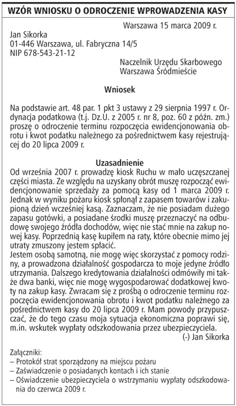 Ordynacja podatkowa upoważnia w przepisie art. 48 par. 1 pkt 3 organy podatkowe do odraczania w przypadkach uzasadnionych ważnym interesem podatnika i na jego wyraźny wniosek, innych niż termin płatności podatku terminów przewidzianych przez przepisy prawa podatkowego. Takim terminem jest właśnie termin rozpoczęcia ewidencjonowania sprzedaży za pomocą kasy fiskalnej.