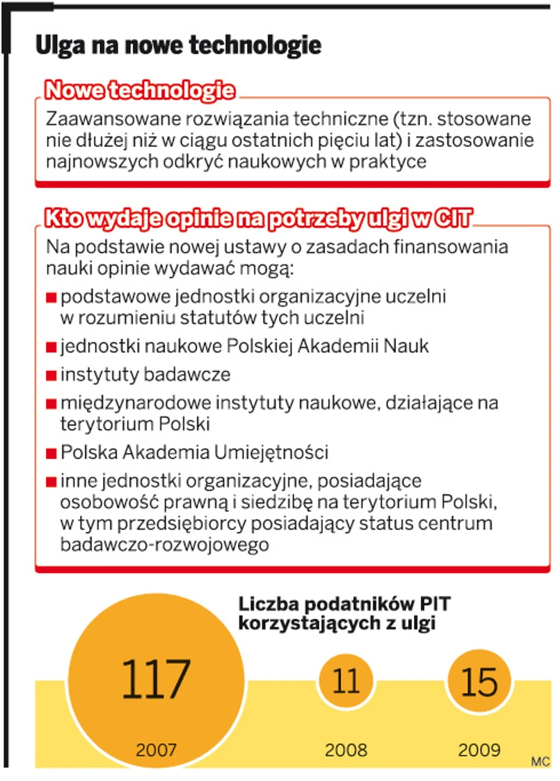 Od 1 października przedsiębiorcy opodatkowani podatkiem dochodowym od osób fizycznych utracili możliwość korzystania z ulgi na nowe technologie odliczanej w rocznym zeznaniu od podstawy opodatkowania. W tym dniu weszła w życie nowa ustawa o zasadach finansowania nauki, do której odwołują się przepisy podatkowe w konstrukcji ulgi na nowe technologie. Mimo że ten sam mechanizm odliczenia obowiązuje zarówno w ustawie o CIT, jak i ustawie o PIT, ustawodawca dostosował do nowych regulacji o finansowaniu nauki (Dz.U. z 2010 r. nr 96, poz. 615) wyłącznie tę pierwszą ustawę. Co prawda, jak pisaliśmy wcześniej, ulga ta jest wykorzystywana w znikomy sposób, to jednak pozbawienie podatników PIT możliwości jej zastosowania jest nierównym traktowaniem względem prawa. Przypomnijmy, że z ulgi na nowe technologie skorzystało w 2009 roku zaledwie 15 przedsiębiorców PIT i 25 rozliczających