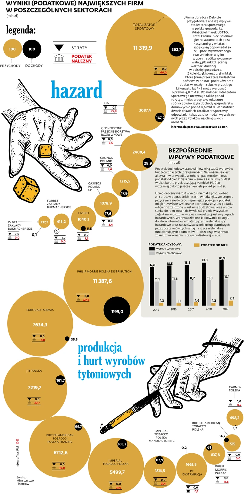 Spośród ok. 1,5 tys. działających w Polsce firm, których biznes wykorzystuje nasze przywiązanie do przyjemności, jak alkohol, tytoń i hazard, mogące przerodzić się w nałogi, niemal 40 znalazło się na opublikowanej przez resort finansów liście największych podatników podatku dochodowego od osób prawnych. Największych pod względem obrotów, bo pod względem wielkości płaconego CIT niewiele z tych podmiotów znajduje się w czołówce (tę okupują banki).