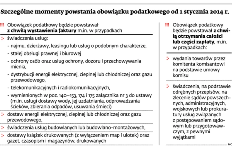 W przypadku świadczenia usług najmu, dzierżawy, leasingu lub innych o podobnym charakterze, a także stałej obsługi prawnej i biurowej obowiązek podatkowy będzie od 1 stycznia 2014 r. powstawał z chwilą wystawienia faktury.