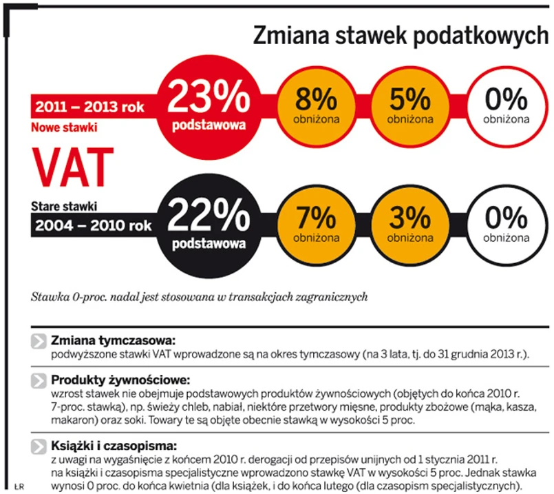 Kasy fiskalne musiały być przestawione przed rozpoczęciem sprzedaży w 2011 r., tak aby na paragonach wydawanych kupującym w styczniu widniały już nowe stawki VAT. Izabela Błońska, ekspert w zespole podatków pośrednich Ernst & Young, podkreśla, że wielu sprzedawców przekodowało ceny towarów i usług z podatkiem (brutto) na ceny bez podatku (netto). Od tych cen system kasowy nalicza VAT według nowych stawek.