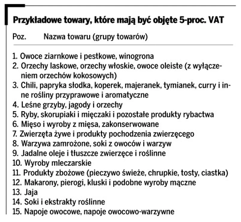 Zgodnie z uzasadnieniem projektu, w efekcie zastosowania obniżonej stawki na podstawowe produkty (m.in. chleb, nabiał, przetwory mięsne, makaron czy soki), przeciętna stawka na żywność ma nie wzrosnąć.